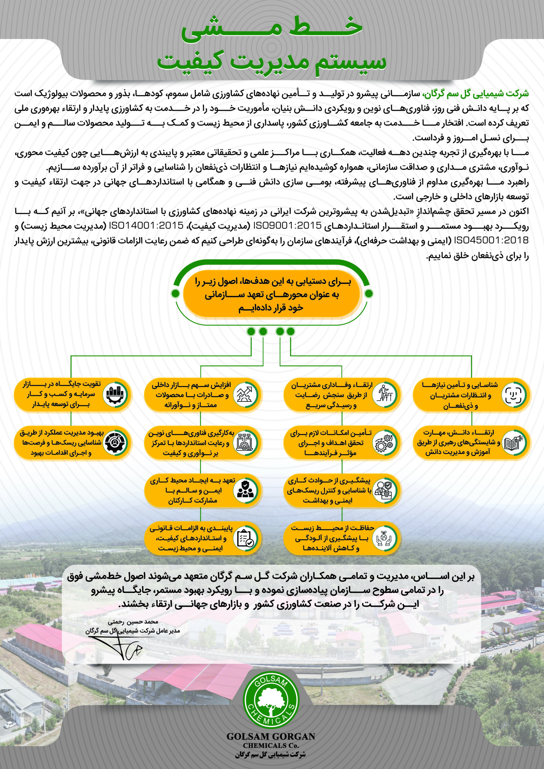 تولید و تامین سموم، کودها، بذور و نهادههای کشاورزی متنوع، با کیفیت ممتاز و مطابق با استانداردهای جهانی با هدف افزایش بهرهوری در کشاورزی، حفاظت از محیط زیست،